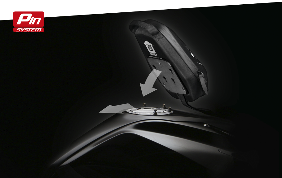 SISTEMUL PIN inovator fixează geanta de rezervor pe motocicletă într-un mod sigur și ușor. 3 sau 4 dintre șuruburile originale ale capacului de gaz sunt înlocuite cu „pini” discreti, făcând instalarea foarte simplă și realizată în doar câteva minute.