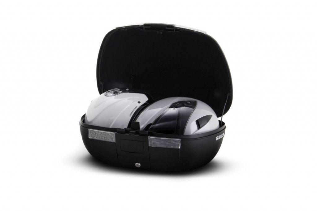 SH45 is large capacity top case for up to two full helmets. Backrest, brake light, inner bag and color covers available as accessory. Plate included.