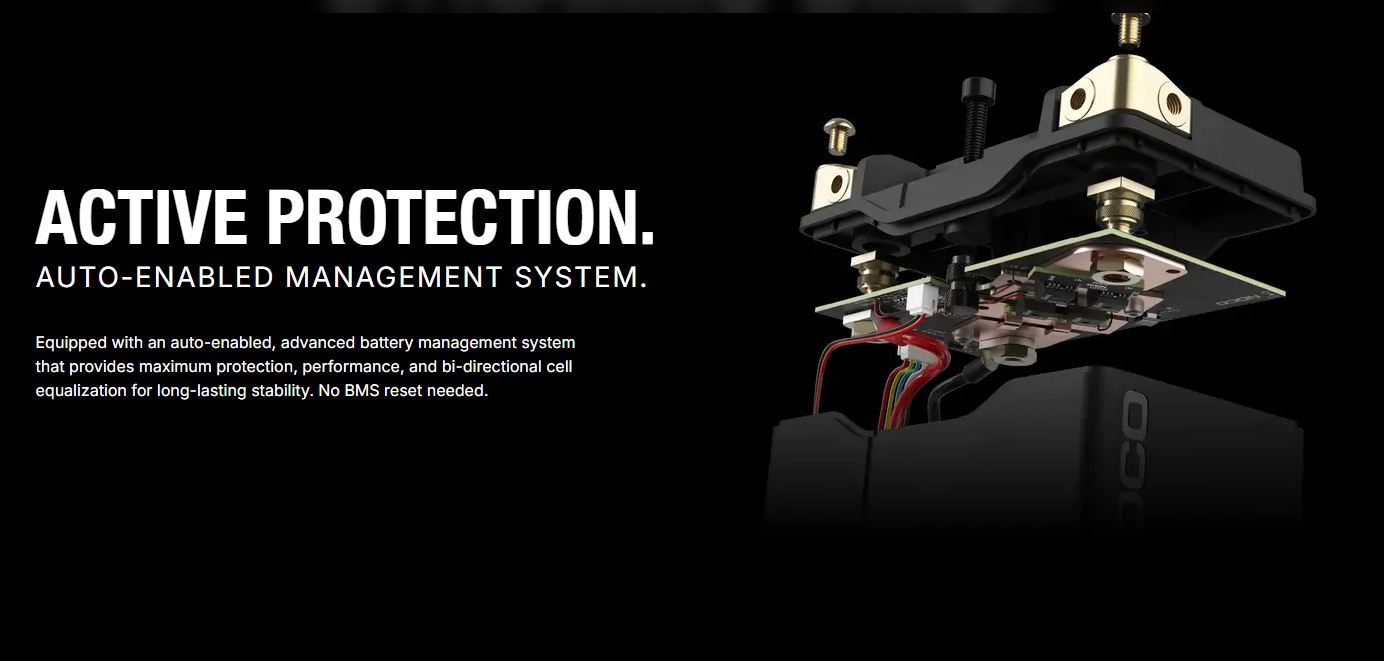 Sistemul integrat BMS (Battery Management System) protejează bateria împotriva supra-încărcării, descărcării excesive, scurtcircuitelor și temperaturilor extreme. Tehnologia Dynamic LTI™ permite pornirea motorului chiar și la temperaturi joase, unde majoritatea bateriilor lithium obișnuite se comportă slab.