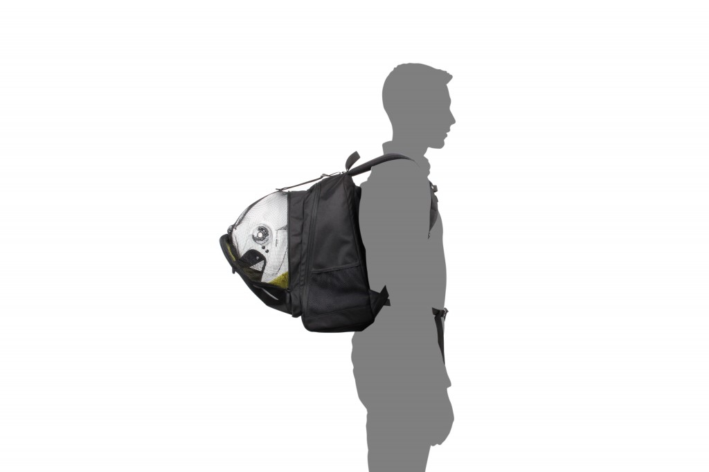 - Mesh pocket with zip fastener to place a jet helmet, with 2 adjustable straps to secure stability.