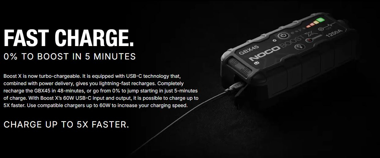 NOCO GBX45 este un starter auto portabil din generația Boost X, proiectat pentru pornirea rapidă a bateriilor descărcate de 12V. Oferă un curent de pornire de până la 1250A, suficient pentru majoritatea motoarelor pe benzină (până la ~6.5L) și diesel (până la ~4.0L), în funcție de starea reală a bateriei și condițiile de temperatură.