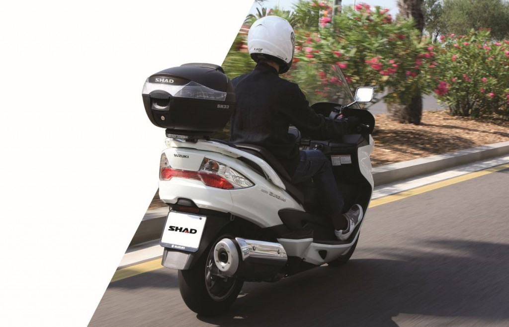 SH33 is compact case, with capacity for full face helmet and gloves. Backrest, brake light and colour covers available as accessory. Plate included.